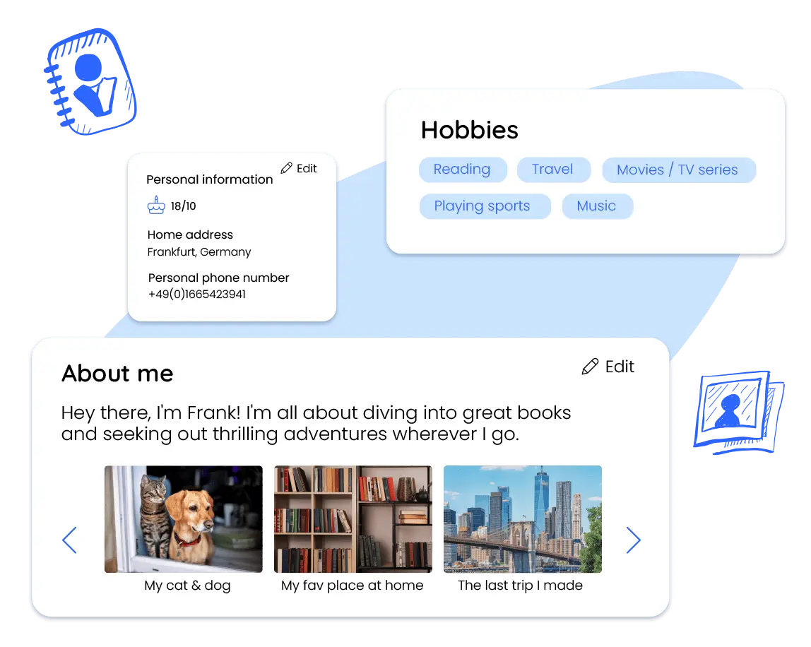 - Description personnelle, anniversaire, loisirs et citation préférée.