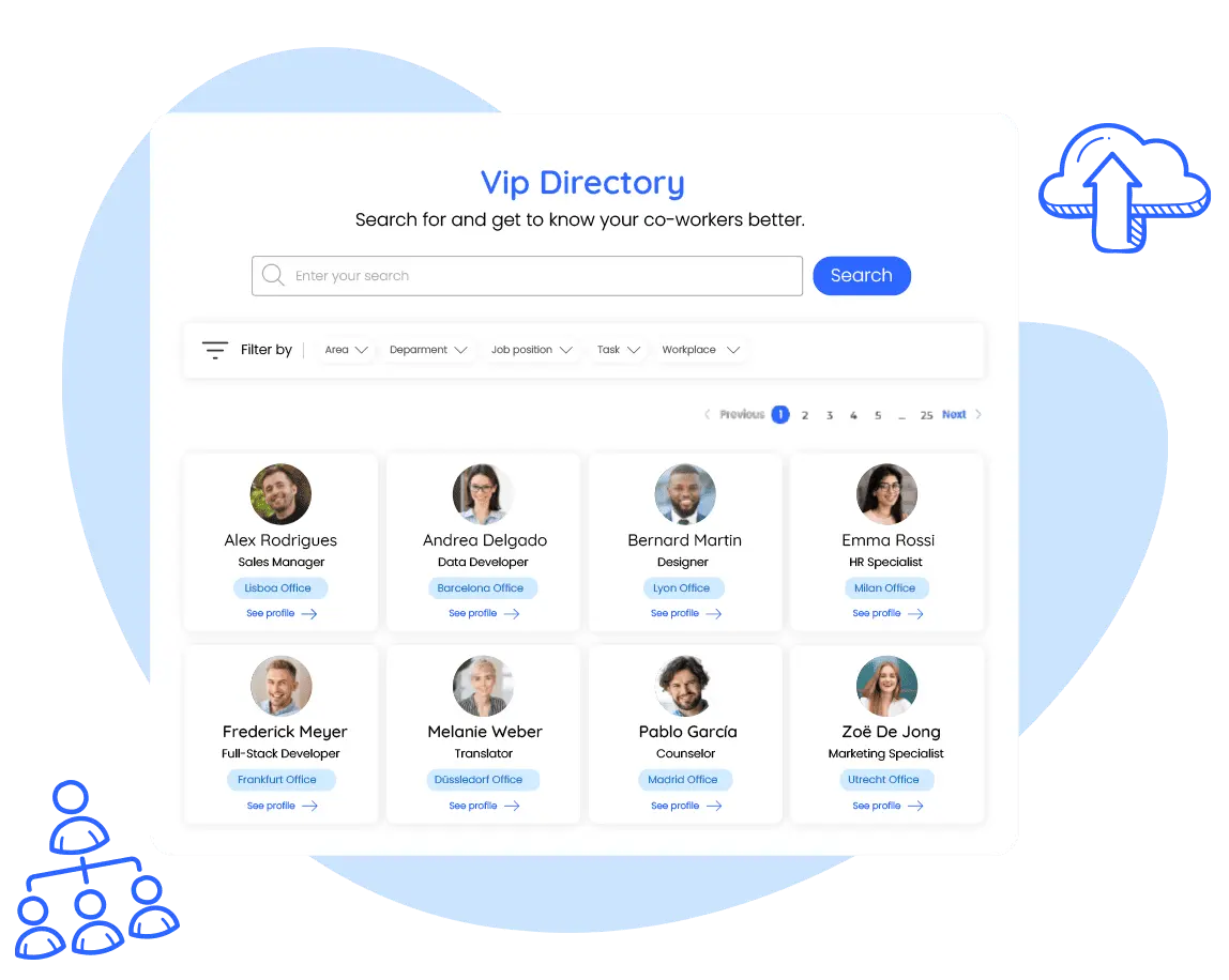 Simplifiez les interactions au sein de votre entreprise grâce à Vip Directory, votre Annuaire du Personnel. Fournissez des informations telles que l’organigramme de l’entreprise et des précisions sur les employés, p. ex., l’intitulé de leur poste, leur département, leur lieu de travail et même leurs hobbies