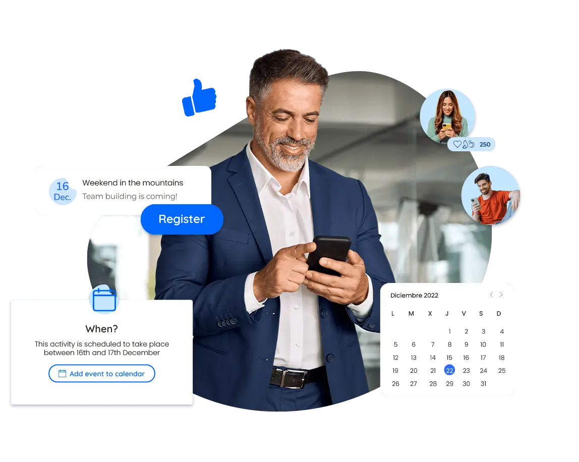 A platform with the complete solution to manage your corporate communication, events and activities, training, surveys and customised communication channels.