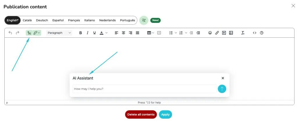The AI Assistant is seamlessly integrated into the content editor, making it both easy and practical to use. Here’s how it works: