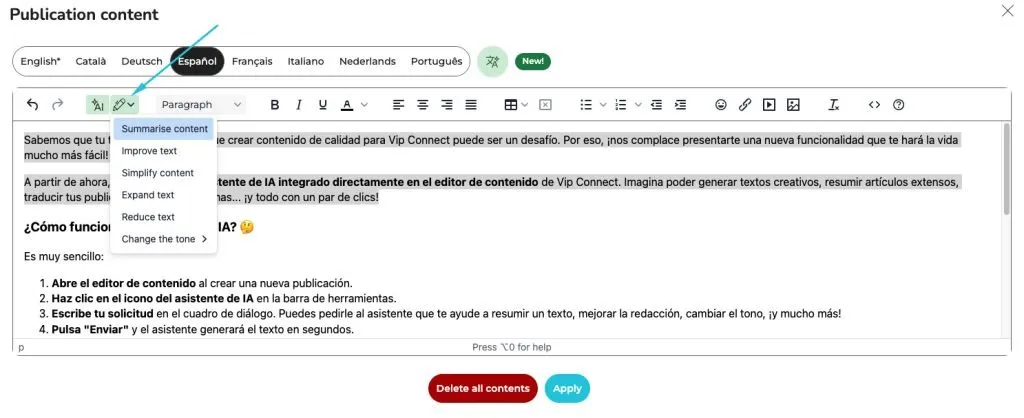 That’s why we’ve designed a tool to simplify your daily work: the new AI Assistant in Vip Connect. With this feature, generating creative texts, translating posts, or adapting the tone of a message is faster and easier than ever. Say goodbye to creative blocks and start producing high-quality content in seconds!