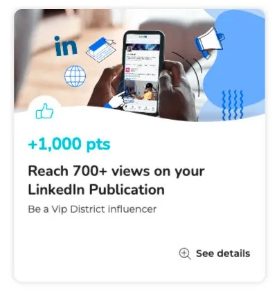 The Vip District example: At Vip District we award points to employees when they have shared one of our LinkedIn posts and it has achieved over 700 views. Our employees are our best ambassadors, and with initiatives like these, the company’s image is built together.