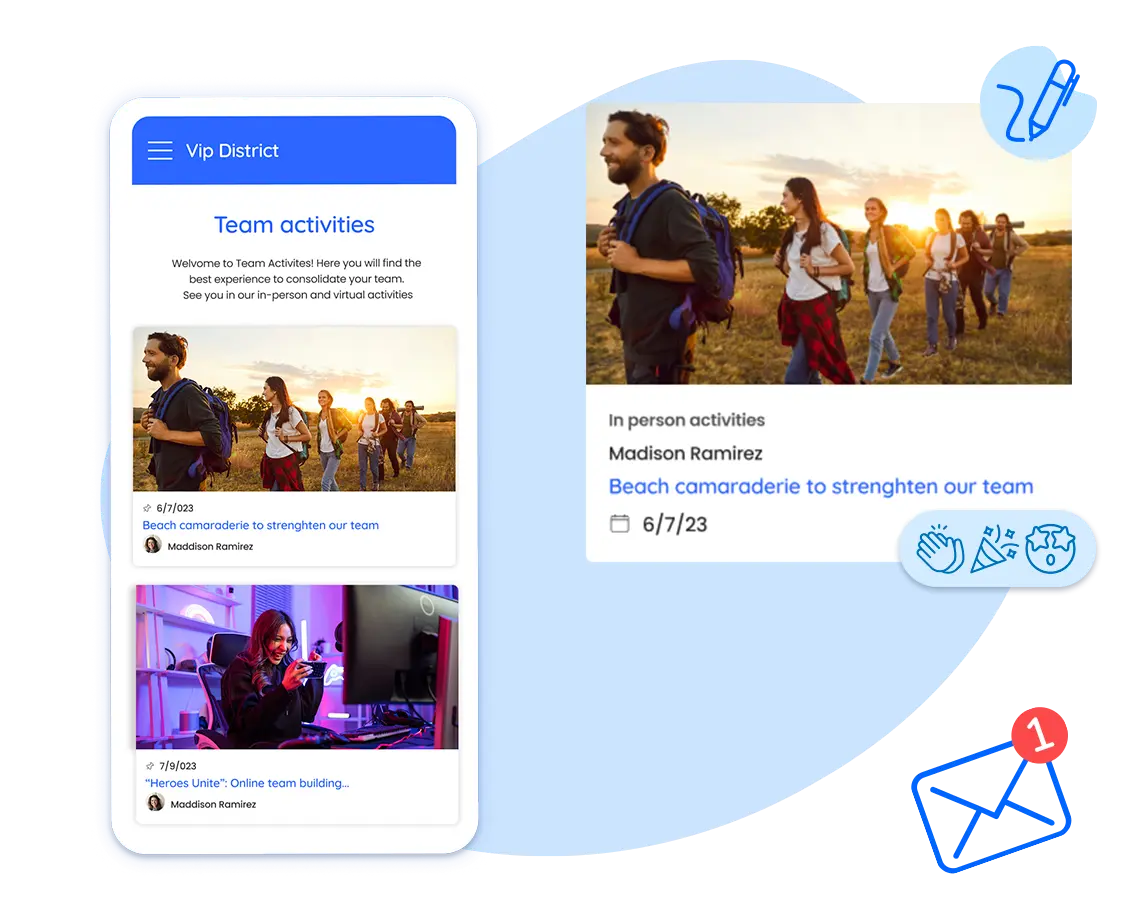 Create a unique space that will be the heart of the relationship with your employees. In addition to centralising your corporate communication, you can create and manage activities, training, surveys and customised communication channels.
