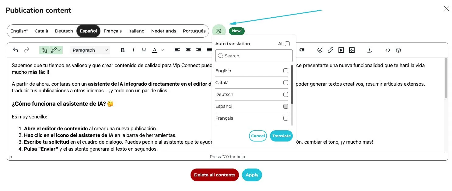 - Example: Have a multilingual team? Write your post in your main language and translate it into any required language, without using external tools.